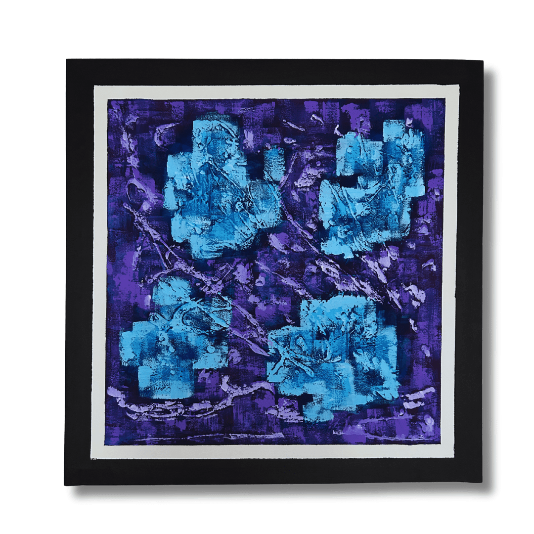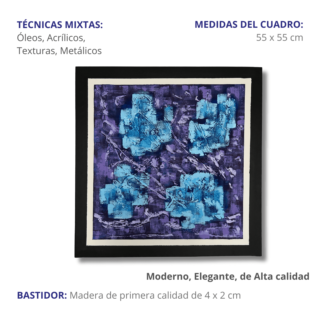 imponente. Sus tonos azules, púrpuras y plateados se entrelazan en una danza fragmentada, creando un